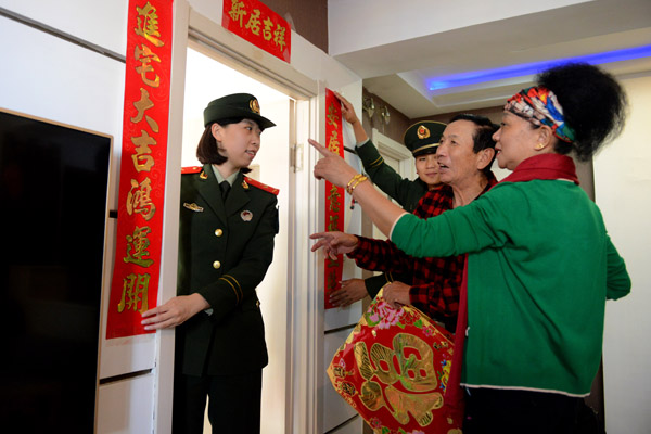 邊防官兵與烈士家屬一起貼對(duì)聯(lián)