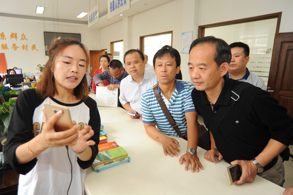 光明村網(wǎng)格員正在向采訪團(tuán)演示“e寧波”平臺(tái)