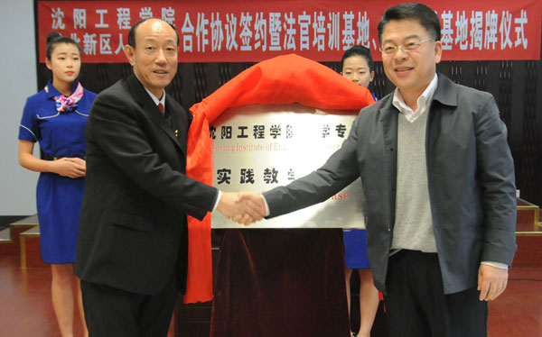 為實現(xiàn)基層法院的審判實踐資源與高等院校的法學(xué)理論對接,培養(yǎng)專家型法官和法律后備人才,11月11日,沈陽市沈北新區(qū)人民法院法官培訓(xùn)基地和沈陽工程學(xué)院實踐教學(xué)基地揭牌儀式在沈陽工程學(xué)院舉行。沈北新區(qū)法院黨組書記、院長侯獻(xiàn)生與沈陽工程學(xué)院院長芮小苗共同為基地揭牌,沈北新區(qū)法院副院長楊琦和沈陽工程學(xué)院副院長宋吉鑫代表雙方在共建協(xié)議上簽字。