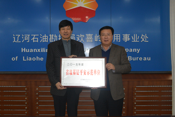 遼河油田政法委常務(wù)副書記藍(lán)子天(右)將平安示范單位牌匾發(fā)給公用事業(yè)處黨委書記趙連永
