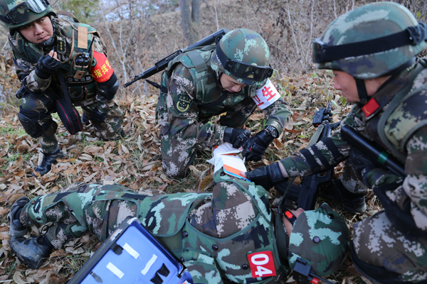 一名戰(zhàn)友“受傷”,醫(yī)務(wù)組立即進(jìn)行救治