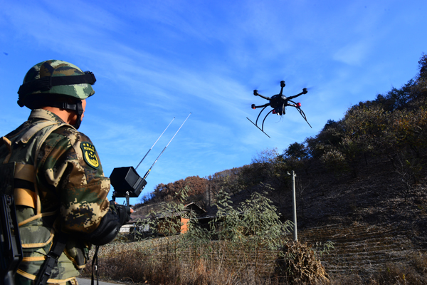 參演官兵啟動(dòng)無(wú)人機(jī)對(duì)藏匿在山地間的“犯罪嫌疑人”進(jìn)行空中偵查