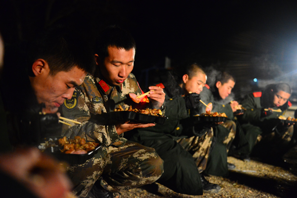 寒冷的夜晚,官兵在野外露營(yíng)