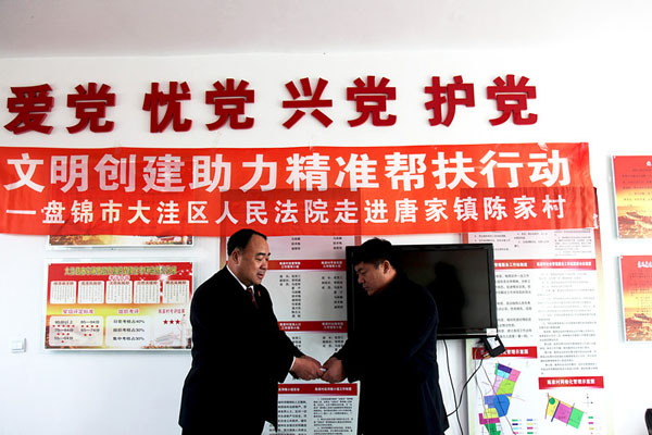 盤錦市大洼區(qū)人民法院黨總支書記、副院長信洪寶和副院長原野帶領(lǐng)各黨支部書記和20余名黨員干警再次深入唐家鎮(zhèn)陳家村開展“精準(zhǔn)幫扶 送法下鄉(xiāng)”活動,這已是大洼區(qū)法院今年第四次來掛點村“走親戚”。與此同時,在“走親戚”幫扶的同時對村民進行法治宣傳教育,讓老百姓在潛移默化中增強法律意識。
