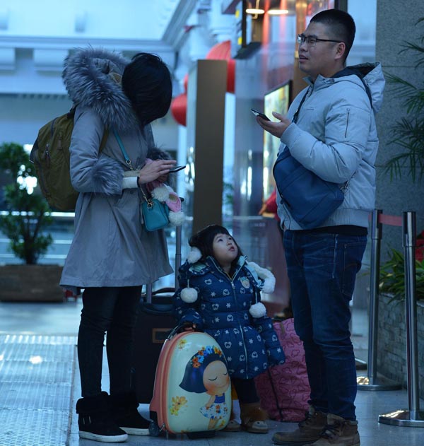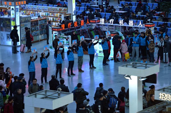 志愿者在北站打出“沈陽北站歡迎您”的字牌歡迎各地旅客