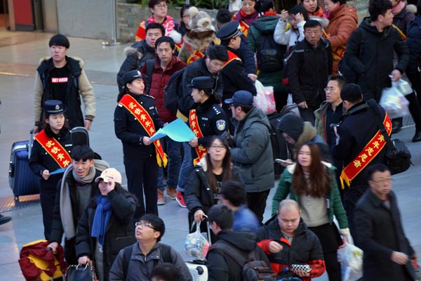 青年民警向旅客發(fā)放春運安全出行宣傳單