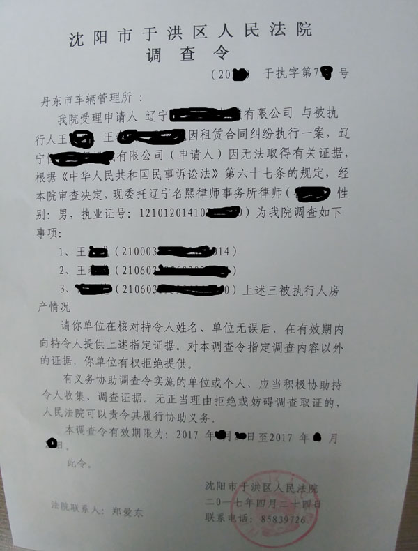 4月19日,大連市中級人民法院簽發(fā)首份調(diào)查令,最終在相關(guān)單位的配合下,律師成功收集到被執(zhí)行人的相關(guān)信息。