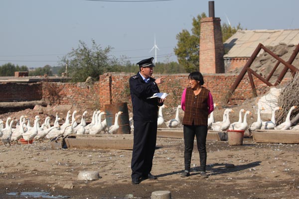 民警深入養(yǎng)鵝戶了解情況,以便更好地調解矛盾
