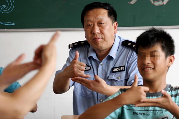 民警在特殊教育學(xué)校和聾啞學(xué)生們一起學(xué)習(xí)手語