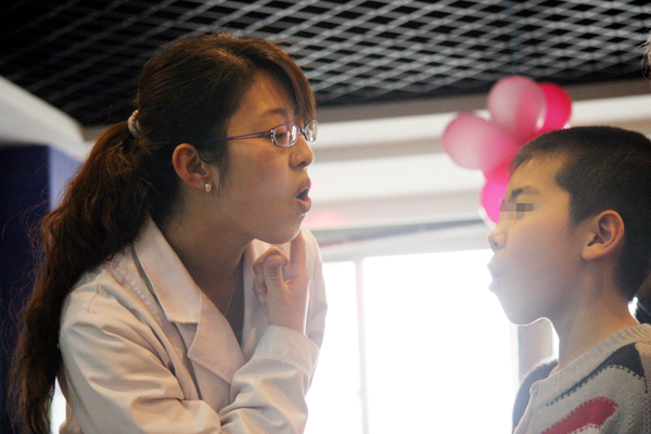 聾兒東東剛來時(shí)已經(jīng)8歲了,他還不會(huì)叫“爸爸、媽媽”,更談不上說話了。為了教會(huì)孩子們發(fā)好每一個(gè)音,付艷讓他們近距離地觀察自己的口型,讓他們用手觸摸自己的鼻翼、下頜、喉部、胸部等發(fā)音部位,感受發(fā)音時(shí)的變化,一遍、兩遍、十遍、百遍……付艷都不厭其煩地教,孩子們的吐沫常常濺到她的臉上,但她從來沒有責(zé)怪孩子,而是不停地鼓勵(lì):“孩子,嘴巴張大,雙唇緊閉,用力呼氣,不錯(cuò)!加油加油!我們?cè)賮怼?rdquo;