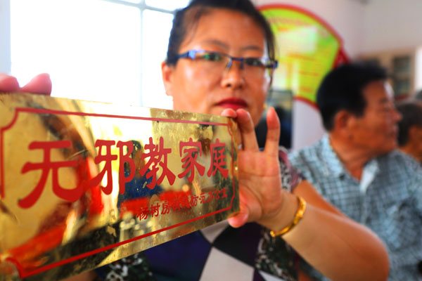 8月17日,大連市普蘭店區(qū)楊樹房街道村民向記者展示無邪教家庭門牌