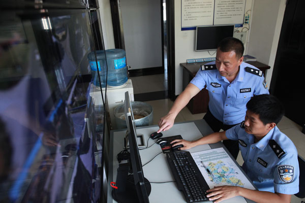 9月18日,鐵嶺縣公安局李千戶派出所所長李雨(左)和同事在派出所進(jìn)行視頻巡邏